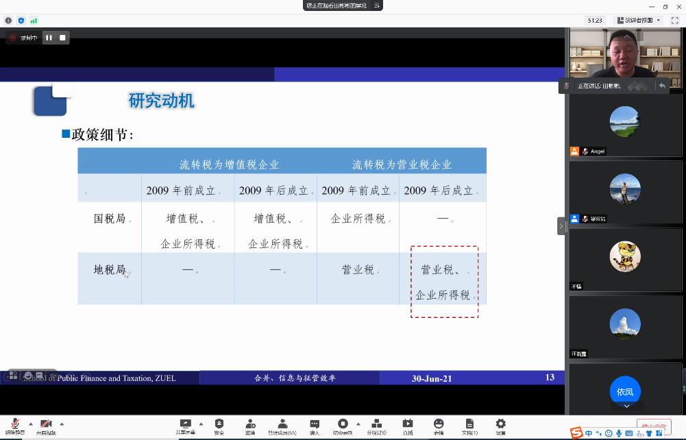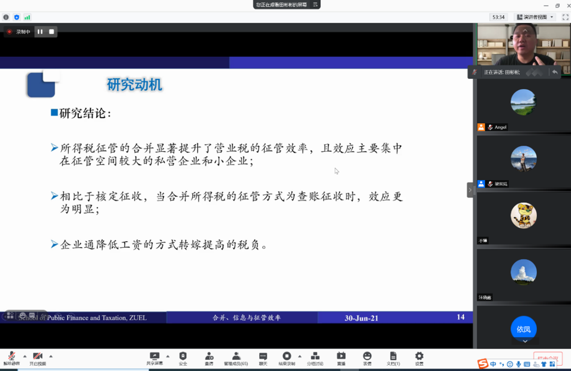 2021年6月30日,由永利集团3044官网欢迎您政府非税收入研究院主办,云南省财政厅非税收入管理处、票据管理中心协办的中国政府非税收入管理高端学术论坛第七期在腾讯会议线上举办。本次论坛邀请中南财经政法大学财政税务学院田彬彬教授进行了题为“合并、信息与征管效率”的交流报告,永利集团3044官网欢迎您党委书记梁双陆研究员担任主持,永利集团3044官网欢迎您众师生与云南省各地财政局人员参与了本次讲座。