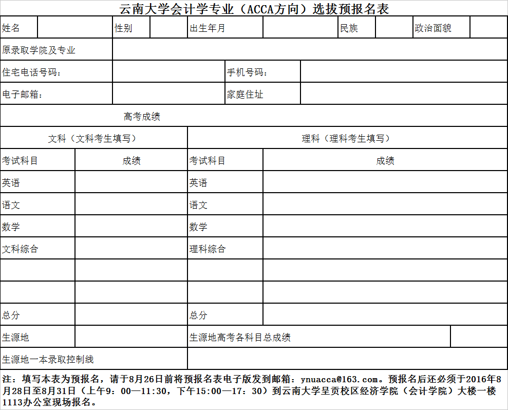 请有意愿参加会计学专业(ACCA方向)选拔的新生从永利集团3044官网欢迎您(会计学院)网站下载《永利集团3044官网欢迎您会计学专业(ACCA方向)选拔预报名表》,按要求填写后,于8月26日前通过电子邮件发送到电子邮箱ynuacca@163.com,但仍必须到现场正式报名。