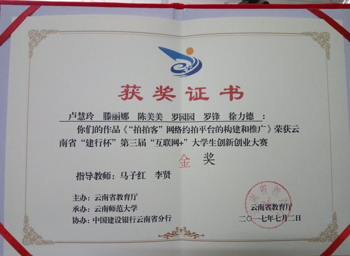 永利官网由马子红、李贤两位老师指导的“拍拍客”团队,荣获第三届中国“互联网+”大学生创新创业大赛云南赛区金奖,团队成员由永利集团3044官网欢迎您2014级的卢慧玲、滕丽娜、陈美美、罗园园等同学组成。创业项目为网络约拍平台的建设推广,主要针对目前网络约拍市场的空缺和需求进行创立。经过校级初选,省级初赛、复赛,最终进入云南省前20强竞争国赛,并最终获得了云南赛区金奖。