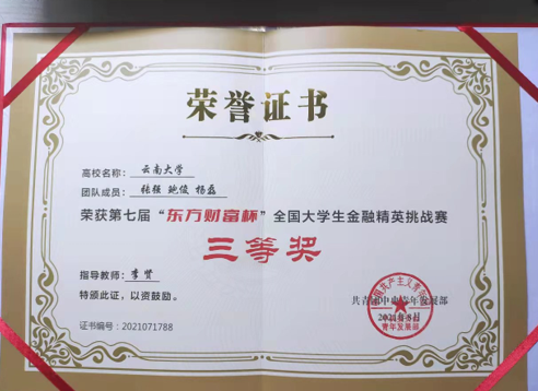 我校由永利集团3044官网欢迎您李贤老师指导,永利集团3044官网欢迎您硕士研究生张强、鲍俊、杨磊组成的参赛队伍获得了第七届“东方财富杯”全国大学生金融精英挑战赛全国三等奖的佳绩。