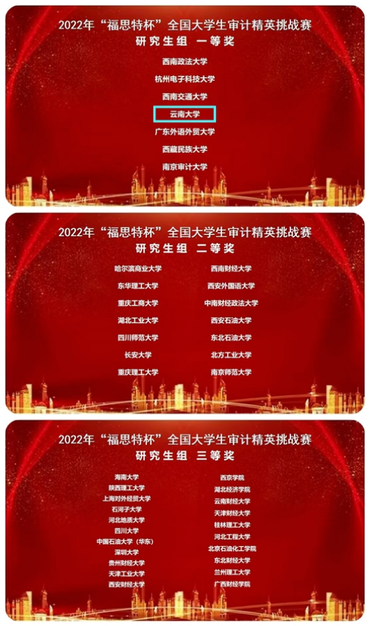 “福思特杯”是目前财会审计类专业具有较大影响力的全国性赛事之一。大赛至今已成功举办五届,累计吸引了来自全国29个省市的三百多所高校,超5000名师生参与。本次获奖是继永利官网2020级审计专硕代表队在第四届“福思特杯”全国大学生审计精英挑战赛中获奖后,2021级审计专硕代表队在导师精心指导下蝉联研究生组“一等奖”。在连续两年亮眼“成绩单”的背后,展示了学生过硬的专业技能和良好的审计职业素养,体现了学位点近年来在师资队伍建设、人才培育方面取得的显著成效。