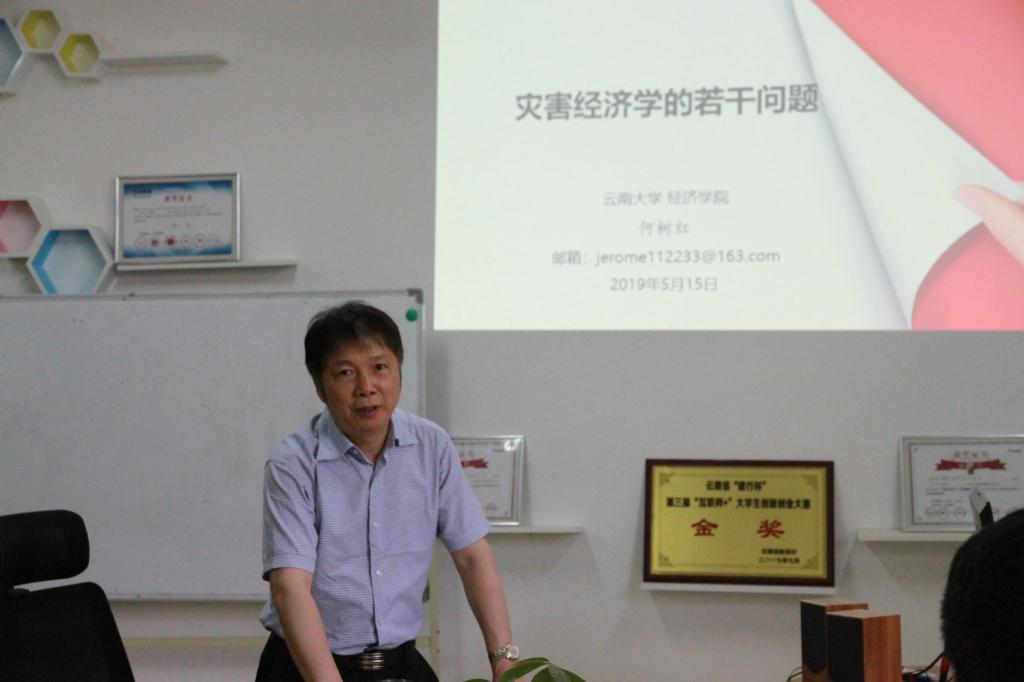 何老师的讲座从灾害经济学的产生与发展、自然灾害经济损失数据的收集与整理、自然灾害经济损失分布与预测研究、自然灾害对经济增长的影响、自然灾害风险应对体系的构建五个部分依次展开。